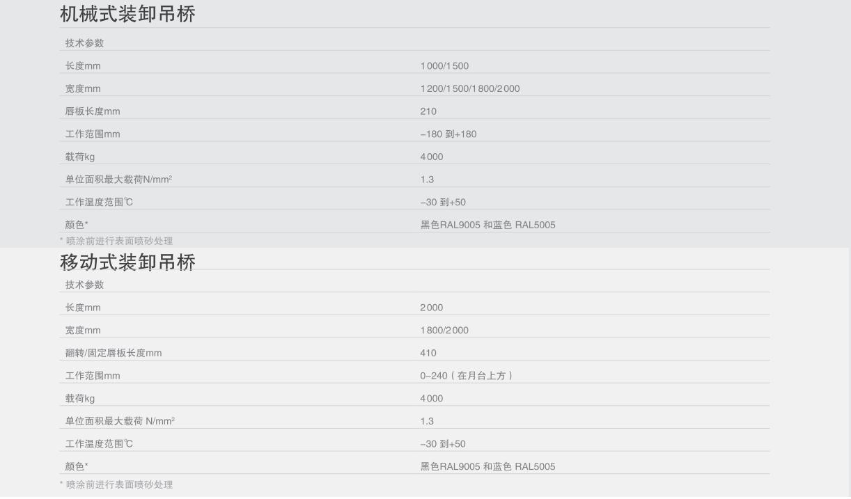 機械式裝卸吊橋安裝在開放式月臺上,可以彌補月臺與卡車尾箱的高度差,最大可達360mm,適用于車用高度與月臺高度差在此范圍內的裝卸貨車輛。工作時,通過側面的把手將機械式吊橋放下直至與裝卸貨車輛車用完全搭接。裝卸貨完成之后,將吊橋回復到起始位置。機械式吊橋具有固定式和滑動式兩種結構。帶有滑動結構的裝卸貨吊橋,可以沿著導軌移動到月臺的不同位置工作。